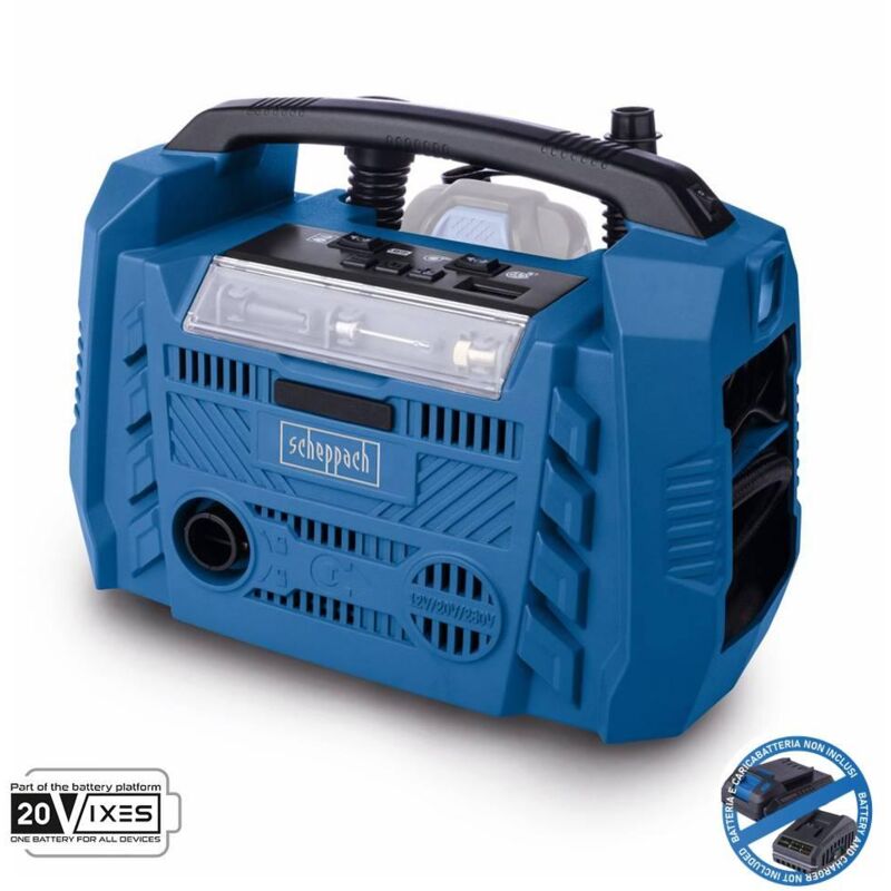 Il compressore a batteria Scheppach Airforce 6 fornisce aria compressa in movimento. Grazie alla funzione ibrida, il compressore può essere utilizzato in modo particolarmente flessibile: l'Airforce 6 ha tre tipi di azionamento: tramite un cavo di alimentazione, una potente batteria da 20 volt e un collegamento da 12 volt. La pressione di esercizio massima di 10,3 bar può essere facilmente impostata utilizzando il pannello di controllo intuitivo. La fornitura comprende anche un adattatore per valvola, un ago a sfera, un adattatore conico per accessori per il nuoto, un tubo ad alta pressione da 75 cm e un tubo per soffiaggio da 44 cm. Essendo parte della serie Scheppach IXES da 20 volt, tutte le batterie e i caricabatterie della serie possono essere combinati con questo compressore ibrido. Batteria e caricabatterie sono disponibili separatamente. - Compressore mobile compatto - perfetto per gli spostamenti, in macchina o per gonfiare palloni, pneumatici o materassi ad aria - Lavoro