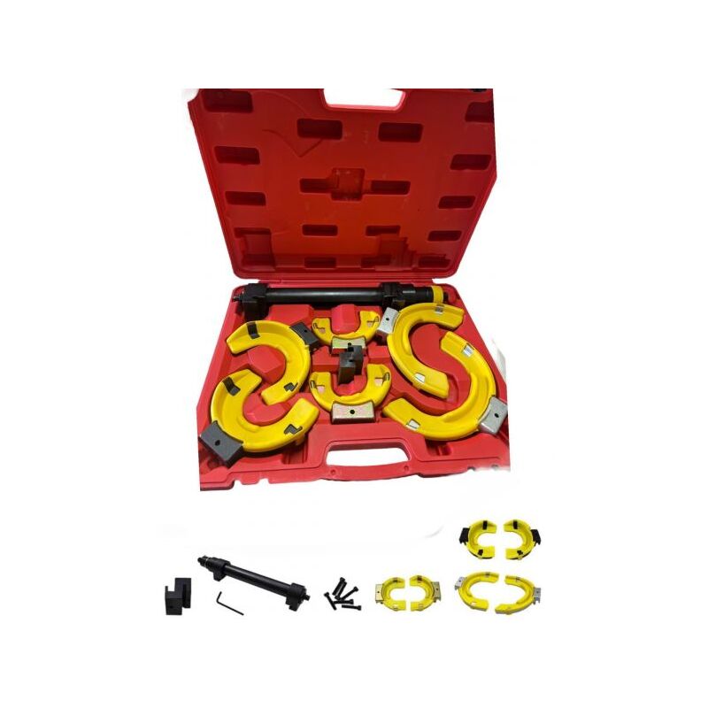 Set universale tenditore molla sospensioni Art.37731 Questo kit di manutenzione contiene tutti gli elementi necessari per il montaggio e lo smontaggio delle sospensioni Mc Pherson che si trovano sugli assi anteriori e posteriori di molti veicoli. È costituito da un tenditore per molla e 6 morsetti (3 coppie) di diverse dimensioni. Neri:80-105mm oro:105-140mm argento:145-190mm capacita' 2500kg