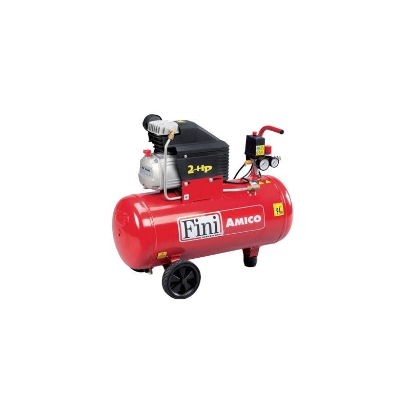 COMPRESSORE FINI AMICO 50 LT. 50 EC2400 Carrellato, con serbatoio Lt. 50, funzionamento completamente automatico comandato dal pressostato, dotato di rubinetto scarico condensa, valvola di sicurezza, manometri, riduttore di pressione. Aspirazione 170 lt/m' potenza hp 2 - 2850 giri/m', pressione max. 8 bar
