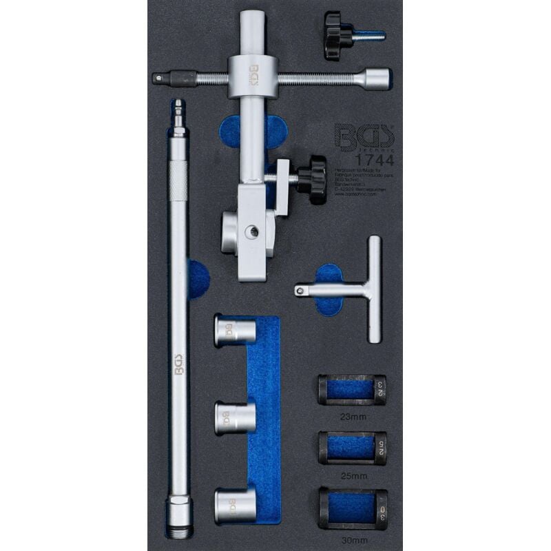 Impedisce la caduta delle valvole del motore nella camera di combustione, poiché l'aria compressa alimentata attraverso la filettatura della candela genera una contropressione Adatto per filettature di candele di accensione M14 x 1,25 e M18 x 1,5 Numerosi accessori Funziona con impugnatura a T o cricchetto da 10 mm (3/8)
