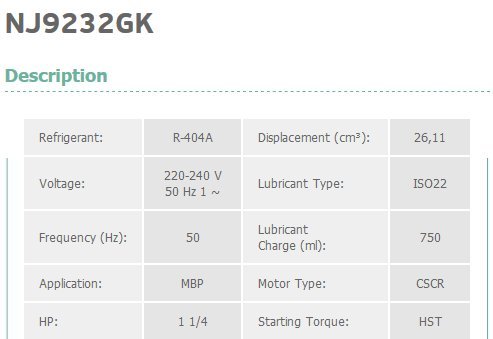 Compressore motore frigo embraco aspera nj9232gk 1,2 hp csr - gas r404a r507