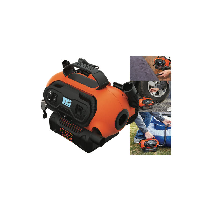 Funzionamento con presa accendisigari 12 volt/230 volt/ batteria al litio 18 volt (non in dotazione), porta per gonfiaggio ad alta pressione e per gonfiaggio ad elevato volume, display digitale e spegnimento automatico, max 160psi - 11 bar, funzione sgonf