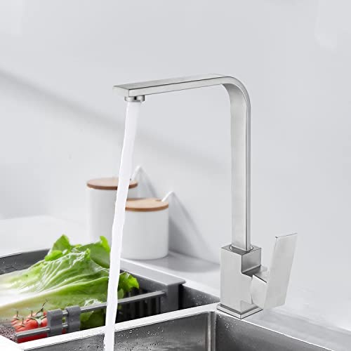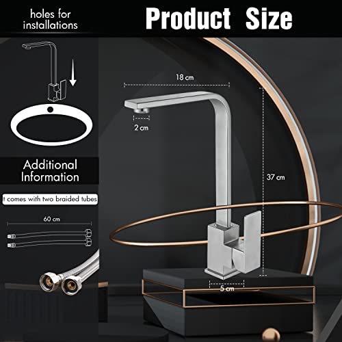 COMVIDA Rubinetto Cucina,Miscelatore Lavello Cucina Monocomando Girevole a 360° in Acciaio Inox,Moderno Beccuccio Piatto Alto Quadrato,Rubinetto Cromato Effetto Cascata,CV-11002
