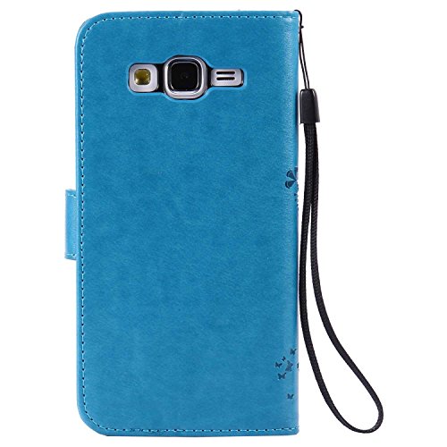 Conber Cover per Samsung Galaxy Grand Prime, Custodia in Pelle PU con Interno TPU Antiurto, Serie Gatto e Albero Flip Case Cover Custodia Portafoglio per Samsung Galaxy Grand Prime - Blu