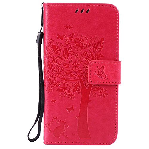 Conber Cover per Samsung Galaxy Grand Prime, Custodia in Pelle PU con Interno TPU Antiurto, Serie Gatto e Albero Flip Case Cover Custodia Portafoglio per Samsung Galaxy Grand Prime - Fucsia