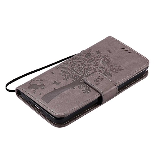 Conber Cover per Samsung Galaxy Grand Prime, Custodia in Pelle PU con Interno TPU Antiurto, Serie Gatto e Albero Flip Case Cover Custodia Portafoglio per Samsung Galaxy Grand Prime - Grigio