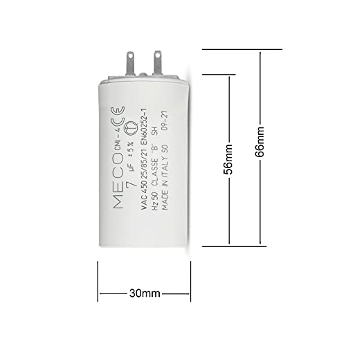 DONNÉES TECHNIQUES - Capacité: 7uF, Tension: 230 V, Dimensions: 30 x 56mm, Taille des connexions: 2 bornes de 2,8mm, hauteur 10mm