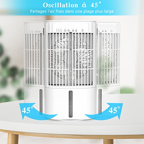 ❉【3 velocità del vento e oscillazione angolare di 45°】Questo mini condizionatore dispone di tre livelli di velocità del vento (alta, media, bassa) e 2 modalità di spruzzo che ti portano durante la calda estate. e ha una funzione di oscillazione automatica. Basta premere il pulsante di controllo oscillante, quindi oscillerà con un grandangolo di ±45 °, in modo da poter sentire l'aria fresca da sinistra a destra