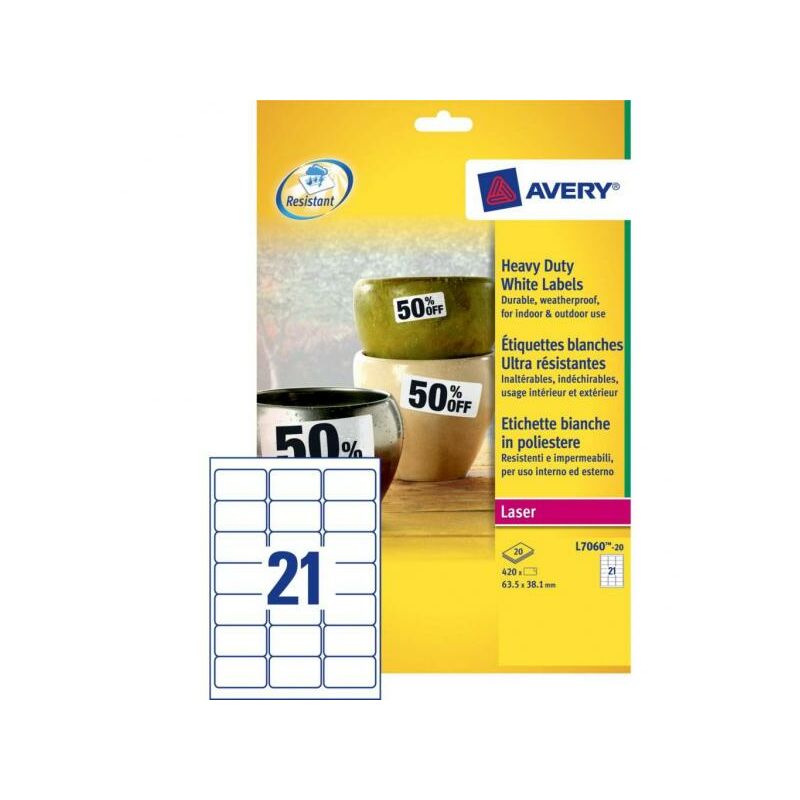 Non ti sei mai trovato in questa situazione? Devi etichettare urgentemente quei prodotti e il tuo fornitore ti consegna le etichette stampate che hai ordinato tra una settimana? Niente paura, utilizza le etichette in poliestere per etichettare i tuoi prodotti in poco tempo - Etichette extra resistente, che durano nel tempo, per uso esterno ed interno - Ideali per etichettare attrezzature di proprietà e inviare campioni di prodotto - Quando hai bisogno di un'etichette più resistente della carta comune - Queste etichette non si strappano, resistono alle sostanze oleose, alla sporcizia e al grasso. Possono essere applicate su metallo, vetro, plastica, legno e a temperature estreme (da -20°C a +80°C). - Risparmia tempo con il software e modelli gratuiti per Microsoft. Gratuito. Facile. Veloce. Larghezza dell'etichetta 6,35 cm Altezza dell'etichetta 3,81 cm Etichette da pacchi 420 pz Fogli per pacco 20 fogli Colore del prodotto Bianco Tipo etichetta Etichetta per stampante autoadesiva