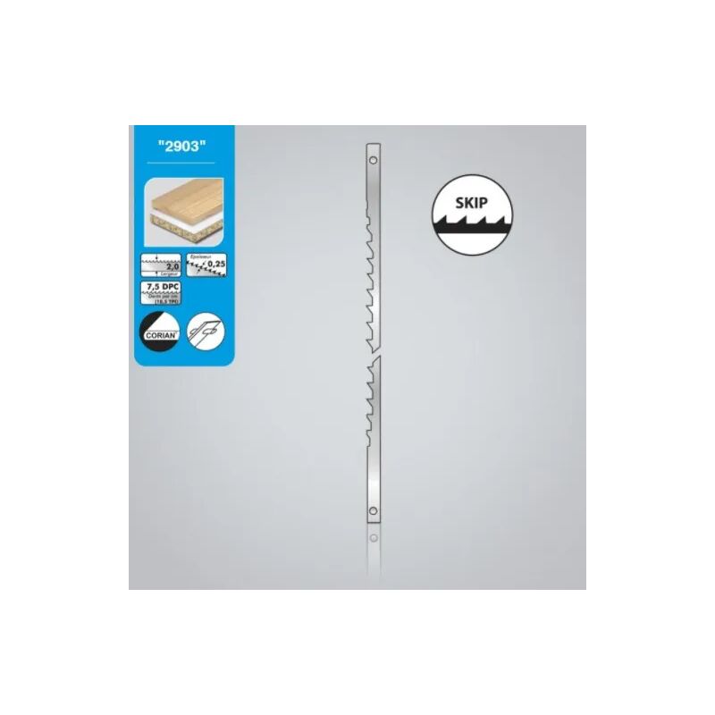 Confezione di 12 lame per traforo elettrico. Lame con perni di interasse: 127 mm Altezza lama: 2 mm Spessore lama: 0,25 mm Numero di denti per pollice: 18,5 Lama adatta al taglio di legno, corno e osso.