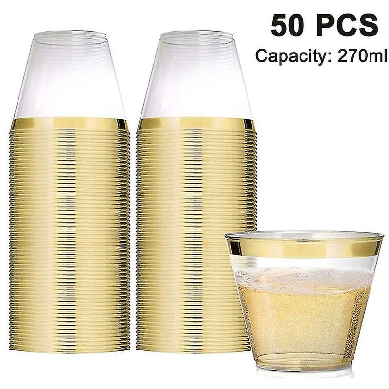 Specifiche: Dimensioni: 9 once / 270 ml Colore: bordo dorato Quantità: 50 Il pacchetto include: Confezione da 50 bicchieri di plastica usa e getta 1. QUALITÀ PREMIUM: queste tazze trasparenti usa e getta ti fanno risparmiare tempo e fatica. La tazza può essere gettata immediatamente dopo l'uso senza lavarla. Gli utenti possono risciacquare/lavare secondo necessità per il riutilizzo. 2. Universale: questa tazza chiara ma splendida è l'accessorio perfetto per le feste, perfetto per matrimoni, Natale, Ringraziamento, balli, ricevimenti, feste di compleanno, vacanze, picnic, eventi di catering e tutte le occasioni. 3. FACILE DA USARE: ideale per bevande fredde come acqua, caffè freddo, bubble tea, frullati, frullati, cocktail ghiacciati, bibite e succhi. 4. DURATA SUPERIORE Questi eleganti bicchieri di plastica con bordo da 9 once sono realizzati in polistirene resistente e durevole per offrire resistenza e durata superiori. Il robusto bicchiere di plastica è protetto da una scatola di