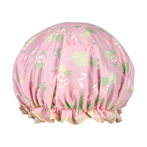 1 confezione da 1 cuffia da doccia da donna, a prova di olio, tappi impermeabili e riutilizzabili con rivestimento a bordo increspato per ragazze, donne, donne, donne, bambini (fenicotteri rosa)