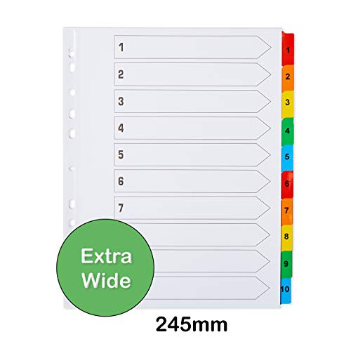 Confezione da 10 - A4+ Divisori Raccoglitori ad Anelli Numerati 1-10 | Extra Larghi 10 Parti con Numeri Schede Colorate Rinforzate Multiforate 150 g/mq