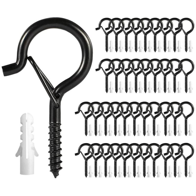 Materiale di qualità: questi ganci a vite possono sostenere fino a 18 kg. Sono realizzati in robusto ferro e rivestiti con vernice nera resistente alla ruggine, quindi non si rompono o arrugginiscono facilmente. Fibbia di sicurezza: questo soffitto con gancio è vento e acqua resistente. Il gancio è dotato di un anello di sicurezza che impedisce agli oggetti di muoversi o cadere a causa di vento, pioggia o altri fattori incontrollabili. Questo è un design molto sicuro e facile da usare. Facile da installare: le viti a gancio sono rapide e facili da installare, puoi usare un martello per battere direttamente il legno o usare una chiave inglese per avvitare il legno. Per installare i ganci a vite sulla parete, è necessario praticare un foro nel muro, inserire un tubo di plastica, quindi inserire i ganci nel tubo di plastica. Si consiglia di utilizzare una punta da trapano da 1/8 di pollice. Ampio campo di applicazione: i ganci a vite sono resistenti al vento e robusti. Puoi letteralmente