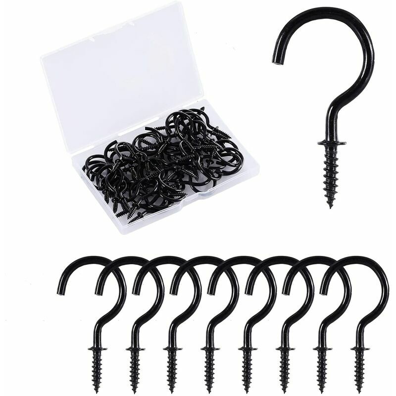 3. Colori: nero. 4. Dimensioni: 2,5 cm: lunghezza totale: circa 39 mm. 6. Lunghezza del filo: circa 13,6 mm. Contenuto: 50 ganci a vite neri da 1'. 1 scatola portaoggetti.