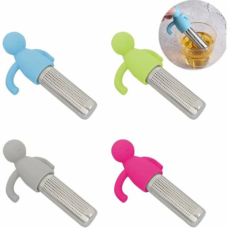 Dimensioni adatte: ci sono 4 graziosi filtri per il tè, che sono grigio chiaro, rosa rossa, verde e blu. La dimensione totale dell'infusore per il tè è di 11,2 x 1,8 cm, la dimensione della maglia fine in acciaio inossidabile è di 5,7 x 1,8 cm, la dimensione giusta per metterlo in quasi tutte le teiere, tazze o tazze, quindi il tuo tè non galleggia, ma si espande completamente e si dissolve in acqua.,Riutilizzabili e sicuri: questi set da tè con colini da tè sono realizzati in acciaio inossidabile 304 con silicone, antiruggine e resistente alla corrosione, sicuri da usare e durevoli per un uso duraturo. Il materiale non è tossico e non trasferisce il calore per scottarti le dita durante la preparazione, il colino da tè ti offrirà un'esperienza piacevole anche in condizioni di uso frequente.,Design carino: questi infusori per tè sfuso sono progettati a forma di un piccolo uomo con una faccia sorridente, adorabile e nuovo, le sue braccia ti permettono di appenderlo alla tua tazza di tè