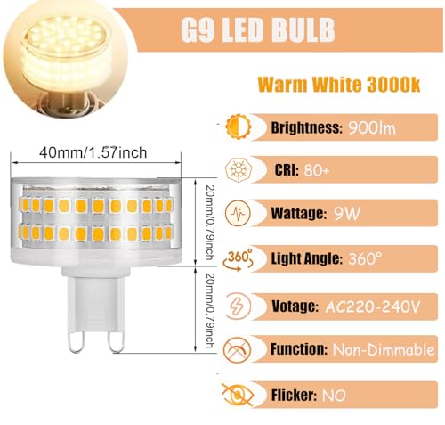 ZFQ Confezione da 6 G9 Lampadina a LED, 9W, Equivalente Alogena da 90W, 900 Lumen, 3000K Bianco Caldo, Angolo di 360 Gradi, Faretti per Lampada da Soffitto, AC 220-240V, Non Dimmerabile