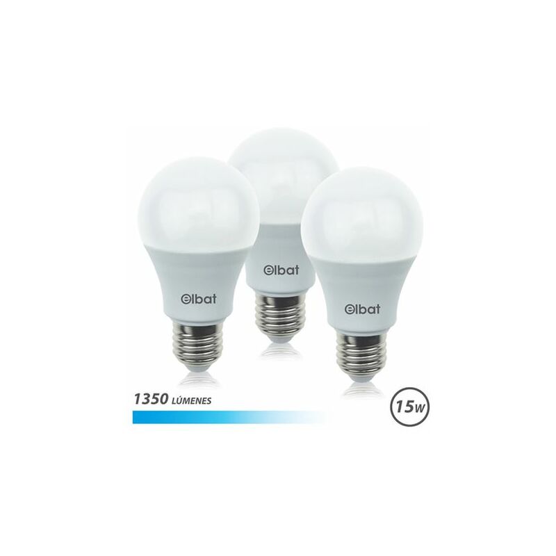 Elbat Confezione da 3 lampadine LED A60 15W E27 1350lm - 6500K Luce Fredda Specifiche: -Potenza: 15W -Lumen: 1350 -Tipo di luce: 6500K Luce fredda -Attacco: E27 -Angolo: 270° -Dimensioni: 60x118 mm -30.000 ore di vita. -15.000 accensioni. -Confezione da 3 unità