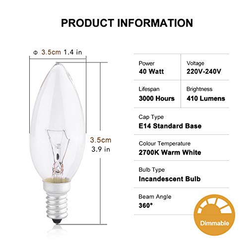 Confezione da 10 lampadine Edison a candela a vite 40 W dimmerabili a candela trasparente SES/E14 piccole lampadine a vite 2700 K, bianco caldo, 410 LM, 240 V