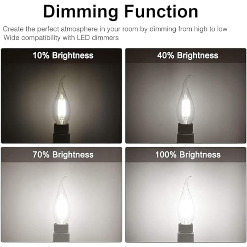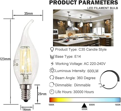 ZFQ Confezione da 10 Lampadine a Filamento LED Edison E14 C35 per Lampadario, Retrofit Classic, 6 W, 600 Lumen, Bianco Freddo 6500 K, Equivalenti a Incandescenza 60 W, AC 220-240 V, Dimmerabile