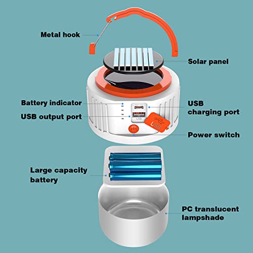 Ricarica solare e USB: 2 batterie al litio di tipo 18650 integrate (1200 mAh per cella) che può essere caricata tramite USB e energia solare, può anche essere utilizzata come power bank di emergenza. Quando si carica con energia solare, la spia si accende. Con un gancio retrattile sulla parte superiore, è possibile appendere la lanterna per illuminare un'area più ampia o stare in piedi su una superficie piana. Perfetto per campeggio all'aperto, trekking, pesca, uragani, interruzioni, emergenze, ecc.