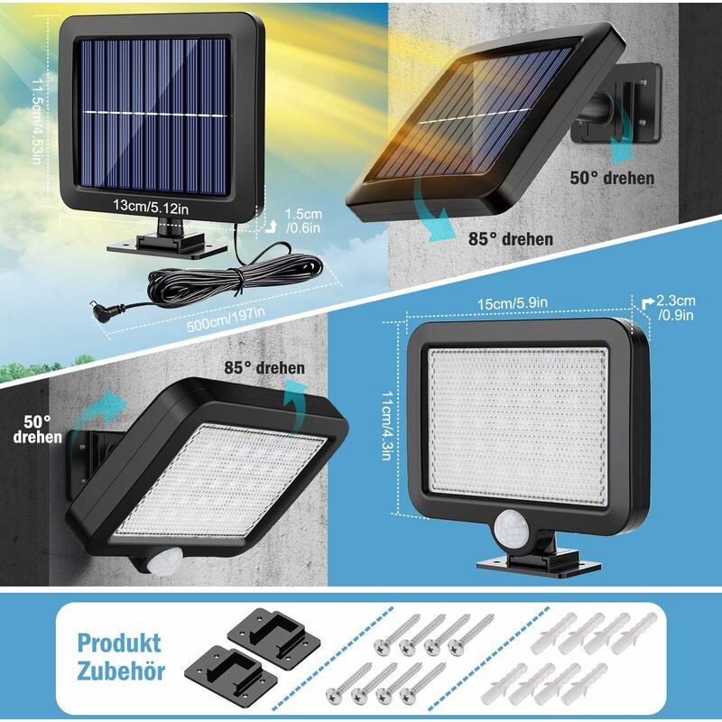 Pannelli solari divisi: rispetto alle tradizionali luci solari, separiamo i pannelli solari dal corpo principale. È possibile utilizzare il cavo impermeabile da 5 m in dotazione per installare i pannelli solari in luoghi soleggiati per immagazzinare più energia durante il giorno e produrre più tempo., La luce è più luminosa di notte. [Illuminazione di alta qualità] 56 luci a energia solare. LED, angolo di illuminazione di rilevamento di 120°, che copre un'area di illuminazione più ampia, fornendo una potenza di illuminazione super luminosa per un'ampia area. Questo crea un ambiente luminoso e sicuro. sicuro per i passanti, anche di notte. Sensore di movimento e sensore di luce: il sistema di rilevamento è una combinazione di sensore di luce e sensore di luce.sensore di movimento. Sensore di movimento PIR aggiornato. giorno può rilevare le persone entro 3-5 minuti. 5 m (quando viene rilevato un movimento, la luce solare si accende automaticamente e si spegne automaticamente quando non