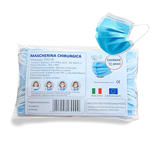Confezione Marco Mascherine Chirurgiche Certificate Ce, Confezioni Da 10 Pezzi, Monouso, Confortevoli E Traspiranti, Con Elastico E Nasello Regolabile - 400 g