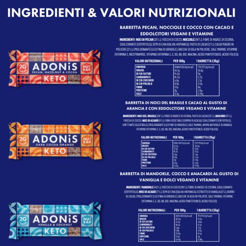 A BASSO CONTENUTO DI CARBOIDRATI NETTI & ADATTE A TUTTI: Le barrette Adonis hanno 2-3g di carboidrati netti per barretta, grazie all'uso di eritritolo, un dolcificante completamente naturale e privo di calorie. Questo le rende perfette per uno spuntino pomeridiano da fare sulla scrivania o dopo un allenamento, senza alcun senso di colpa. Stai seguendo una dieta vegana o vegetale? O forse una dieta Keto, Atkins o a basso contenuto di di carboidrati?