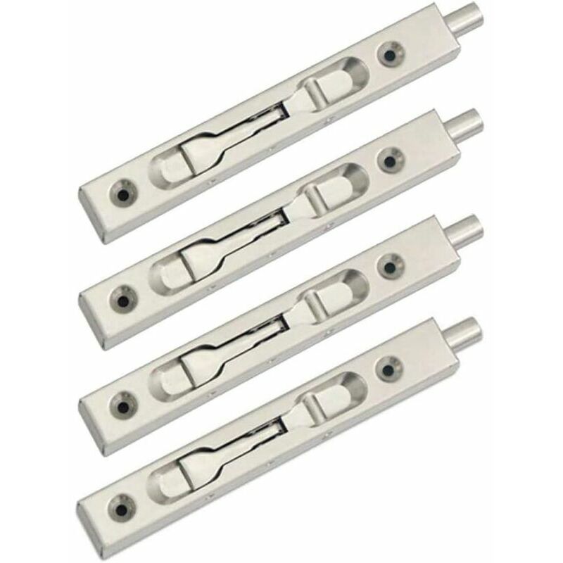 Set di 4 bulloni a filo da 6 pollici, dimensioni 15 cm x 2 cm (larghezza) x 1,6 cm (profondità), profondità della scanalatura richiesta 1,6 cm, bullone sporgente 1,4 cm. . Realizzato in acciaio inossidabile 304 acciaio, finitura spazzolata, affidabile e durevole. Progettato per l'uso in applicazioni di porte in legno per proteggere l'anta inattiva di una serie di porte doppie.... . Incassato nel bordo della porta e completamente nascosto quando le porte sono chiuse. . Leva caricata a molla che ruota su e giù, è facile da usare e adatta per i bordi e il retro della porta. Viene fornito con un set completo di viti per l'installazione (NO istruzioni incluse, sarà preferibile l'installazione da falegname).