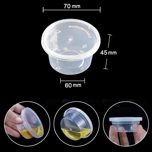Ampia applicazione: questi piccoli contenitori in plastica con coperchio sono perfetti per tutti i tipi di salse o piccoli oggetti, come condimenti per insalata, olio, salse, salse, oggetti artigianali, gioielli, ecc. Può essere utilizzato per una vasta gamma di catering, servizio di cibo, servizi di consegna di cibo da piccole e grandi imprese e ristoranti. Abbastanza per le tue esigenze quotidiane.