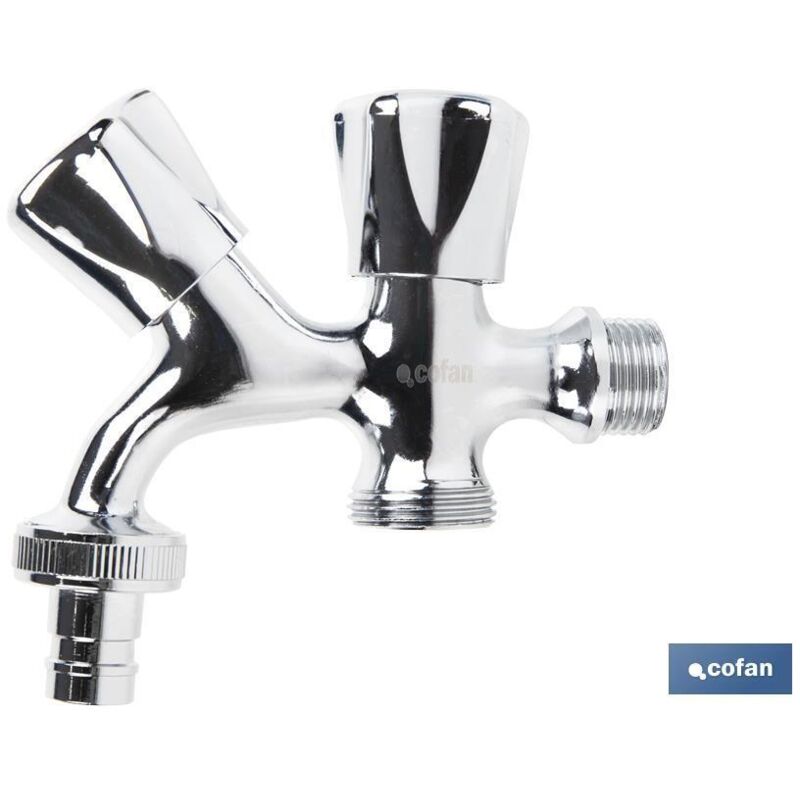 Confezione da due rubinetti doppia uscita acqua per lavatrice o lavastoviglie. Il corpo è realizzato in ottone con finitura cromata e maniglia in ABS. Ha un ingresso filettato da 1/2'' e due uscite filettate da 3/4''. Fornisce un'apertura e una chiusur