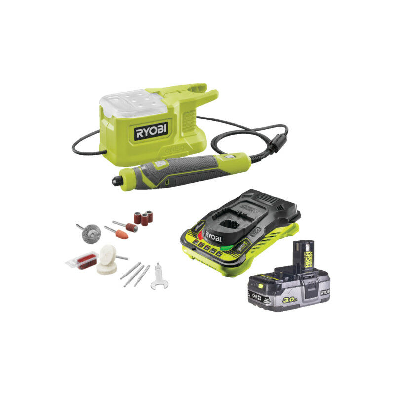 Presentazione: La confezione RYOBI contiene il miniutensile RYOBI 18V OnePlus - RRT18-0 e i suoi accessori: 1 batteria ad alta energia da 3,0Ah e 1 caricatore ultra rapido. Questo strumento piccolo e compatto si adatta ovunque e sarà utile in molte situazioni! È ideale per piccoli lavori di taglio e foratura. Grazie al controllo della velocità da 4400 a 23000 giri/min, si adatta alle vostre esigenze. Con i 15 accessori inclusi nella confezione, avrete tutto il necessario per segare, levigare, incidere o smerigliare. La confezione comprende anche 1 batteria e un caricatore. La batteria da 3,0 Ah è dotata della tecnologia High Energy, che significa un tempo di lavoro 3 volte superiore e maggiori prestazioni rispetto alle tecnologie precedenti. Infine, il caricatore ultra rapido vi permetterà di ricaricare le batterie da 18 V in solo 1 ora. Vantaggi: OnePlus RRT18-0 Mini utensile multifunzione da 18V: Prodotto One+ compatibile con batterie della stessa gamma e tensione Viene fornito con