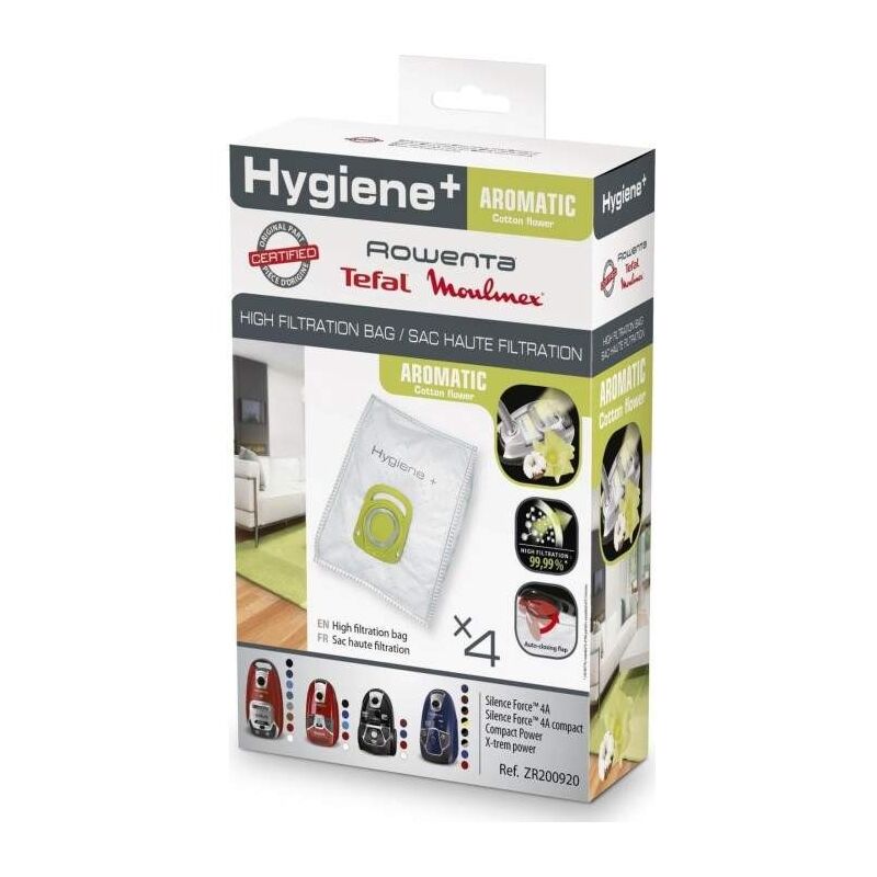 Confezione di 4 sacchetti igienici + aromatici - ZR200940 - [ASPIRATEUR ROWENTA:] RO3125EA/4Q0, RO6844EA/411, RO6442EA/410, RO7490EA/410, RO6371EA/410, RO6843EA/411, RO6491EA/410, RO6475EA/410, RO6834EA/411, RO3950EA/4Q0, RO6886EA/410, RO6831EA/410, RO7747EA/410, RO6383OA/410, RO6391EA/410, RO7350EA/410, RO6866EA/411, RO6833EA/410, RO6381EA/410, RO6493EA/410, RO6841EA/412, RO3951EA/4Q0, RO6835EA/410, RO6843EA/410, RO6821EA/411, RO6851EA/411, RO7793EA/411, RO7366EA/410, RO7321EA/410, RO6881EA/412, RO3953EA/4Q0, RO3923EA/4Q0, RO3969EA/4Q0, RO6466EA/410, RO3153EA/4Q0, RO7481EA/411, RO7487EA/411, RO6886EA/411, RO7353EA/410, RO7380EA/410, RO6331EA/410, RO3950EA, RO6835EA/411, RO6856EA/411, RO6441OA/410, RO6883EA/411, RO6497EA/410, RO3142EA/4Q0, RO7373EA/410, RO3945EA, RO7762EA/410, RO6821EA/410, RO3171EA/4Q0, RO3186EA/4Q0, RO6361EA/410, RO3945EA/4Q0, RO6453EA/410, RO3985EA/4Q0, RO6831EA/411, RO6373EA/410, RO6879EA/411, RO6495EA/410, RO6331OA/410, RO6457EA/410, RO6365EA/410, RO6899EA/412