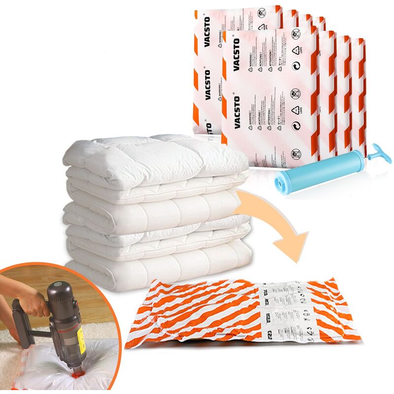 Aumenta lo spazio di archiviazione Se utilizzati correttamente, consentono di risparmiare fino all'80% dello spazio di archiviazione. Non preoccuparti che la valigia o il guardaroba non abbiano abbastanza spazio Doppie cerniere e valvola di aspirazione unidirezionale. Le nostre borse salvaspazio sono dotate di doppie cerniere e valvola di aspirazione unidirezionale per raggiungere lo scopo di isolare l'aria e sigillare a lungo. Consigli per la conservazione Super Jumbo (50 x 40): 6 cuscini o 1 set letto matrimoniale Jumbo (40 x 30): 4 cuscini o 1 letto matrimoniale Grande (32 x 24): 10-12 pullover o 2 cuscini Taglia M (28 x 20): 8- 10 tiri Taglia S (24 x 16): 6-8 tiri. Suggerimenti: Se lo usi a casa, è si consiglia di collegarlo a qualsiasi tubo per aspirapolvere standard per ottenere i risultati più velocemente.