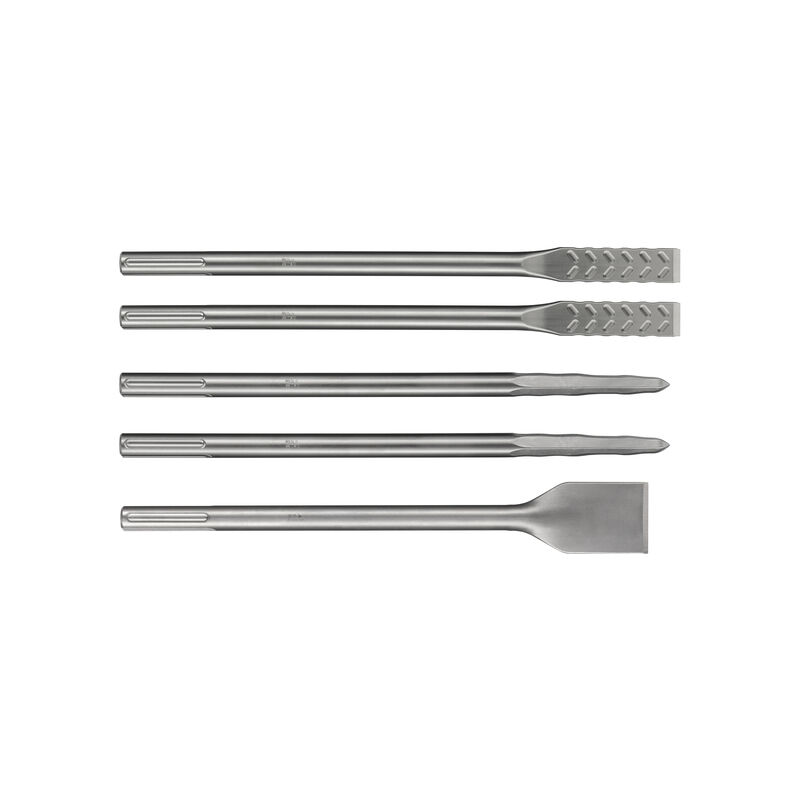Set di scalpelli SDS-MAX Premium (5 pezzi): 2 scalpelli per calcestruzzo da 400 mm 2 scalpelli piatti 25x400 mm 1 scalpello grande 50x380 mm Il lavoro di demolizione è più produttivo. Gli scalpelli sono dimensionalmente stabili e la loro durata è maggiore.