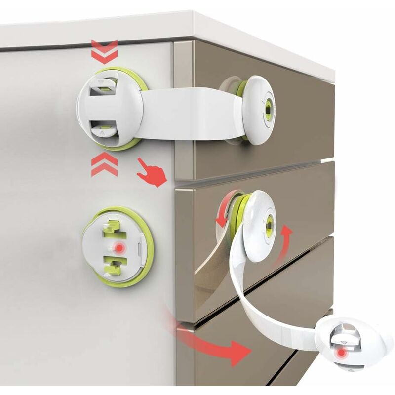 Proteggi il tuo bambino - Ogni confezione contiene 10 lucchetti di sicurezza per bambini da utilizzare in casa. Con le nostre serrature per armadio a prova di bambino, puoi stare tranquillo mentre i tuoi bambini esplorano la tua casa. Presa più forte - Nessuna perforazione. Basta sbucciare, attaccare e il gioco è fatto. Facile da installare senza danneggiare i tuoi mobili e fornisce una protezione completa per il tuo bambino. Funzionamento a doppio pulsante: richiede la pressione simultanea del doppio pulsante, quindi l'estrazione della parte dalla serratura. I più piccoli hanno difficoltà a capire come sbloccarli. Qualità e durata premium: realizzati con materiali ABS atossici che possono essere utilizzati su superfici piane e angoli senza rompersi. Adatto a bambini e animali domestici. Facile da usare - 1. Superficie pulita 2. Per prima cosa rimuovi la carta. Incollare il fermo e premere con decisione dopo aver incollato. Lascia riposare il fermo per 24 ore. Viene utilizzato su