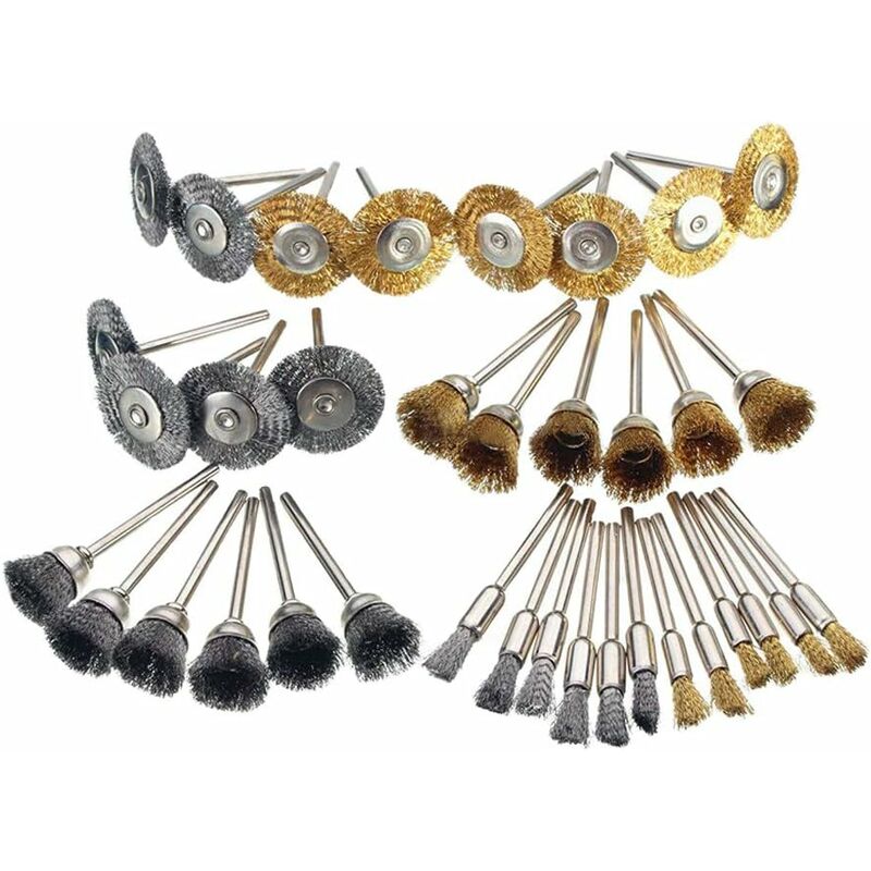 Questo set di spazzole per lucidatura è composto da 36 spazzole per ruote metalliche, ce ne sono 3 tipi in diversi diametri e due materiali di acciaio inossidabile e ottone, che possono soddisfare le tue diverse esigenze. < p>Dimensioni del prodotto: ruota il diametro del tipo è 25 mm, il diametro della ciotola è 15 mm e il diametro della spazzola è 6 mm. Oltre a queste informazioni, il gambo di questi tre tipi di spazzole in filo d'acciaio è di 40 mm e il diametro è di 3 mm. Le spazzole in filo metallico vengono utilizzate per rimuovere la vernice di ruggine e gli schizzi di saldatura su qualsiasi tipo di parte metallica o superfici. È adatto a molteplici usi. Tienine uno nel carrello, nel garage, nell'ufficio e nella cucina. Compatibile con trapano elettrico, smerigliatrice elettrica e smerigliatrice sospesa con un mandrino di circa 3 mm di diametro, oltre a reti a strascico in filo di bambù e prodotti in legno. Adatto alla maggior parte degli utensili rotanti come trapano