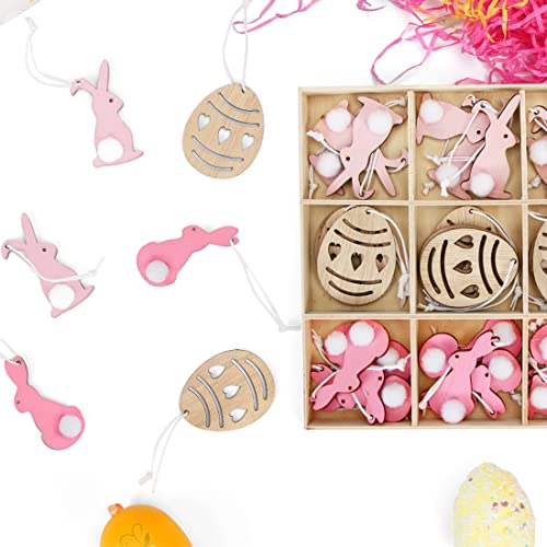 【Ciondolo coniglio in legno di Pasqua】 contiene 12 coniglietti rosa chiaro, 12 uova di Pasqua color legno e 12 coniglietti rosa, per un totale di 36 ciondoli in una scatola di legno, perfetti per decorazioni pasquali e primaverili.