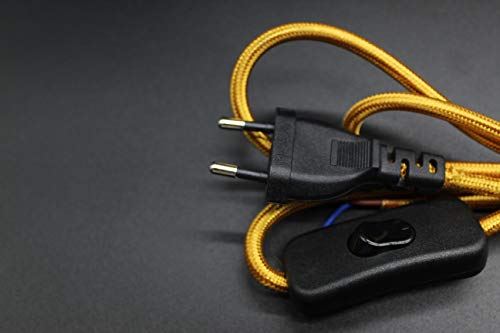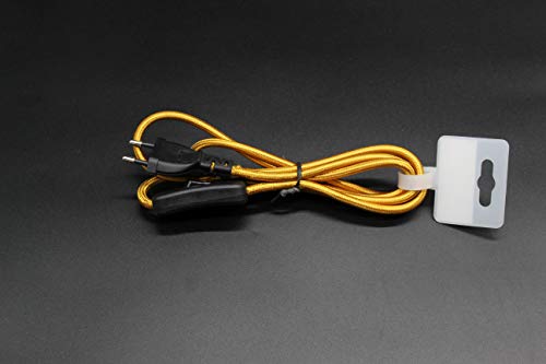 Cavo di collegamento tessile. Questo cavo decorativo è ideale per collegare lampade o apparecchi elettrici. Il tocco decorativo è dato dal cordino rivestito in oro, con spina nera. Al centro del cavo c'è anche un interruttore a mano nero. È un meccanismo molto affidabile e robusto.
