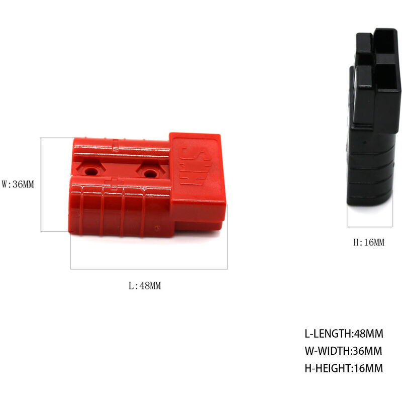 Connecteur rapide 5OA, connecteur bipolaire batterie Matière: plastique et métal Température: Température de fonctionnement -20 C à 105 C Applicabile: chariots élévateurs, remorques, camping-cars, etc. Domaines d'application: batterie di trazione, batterie, alimentazioni UPS, chariots élévateurs, caricatori, véhicules électriques, onduleurs, alimentations de communication, ecc. Contatti en cuivre plaqué argent avec plates à ressort en acier inoxydable Diamètre du câble: 2,6 mm = 4-6 mm² Boîtier de connecteur en plastique résistant aux chocs de 48 mm x 35 mm x 16 mm Tensione massima: 600 V max. Courant continu: 50A Taille maximale du câble: 4-6 mm² Combinaison: 2 ensembles - fiche de connecteur de chariot élévateur rouge 50A600V + guadagno 1-4