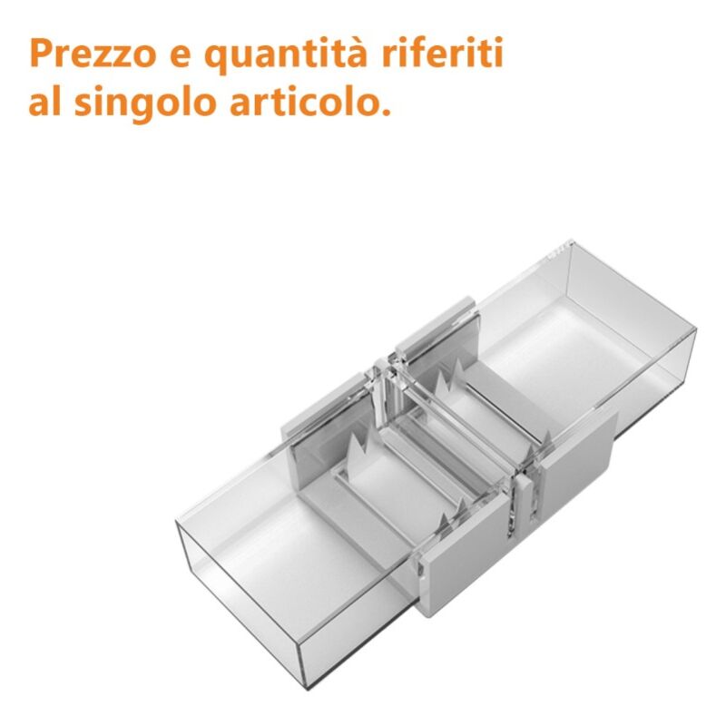 Connettore di giunzione per strisce LED 220V. Compatibile unicamente con le strisce led Alcapower codici 927023, 927024, 927025, 927026, 927027 e 927028 Larghezza: 16mm Altezza: 11mm Lunghezza: 36mm Compatibile con la Striscia led 5m COB IP65 monocolore da 14W/MT 220V - 3000K-4000K-6000K Compatibile con la Striscia led 20m COB IP65 monocolore da 14W/MT 220V - 3000K-4000K-6000K