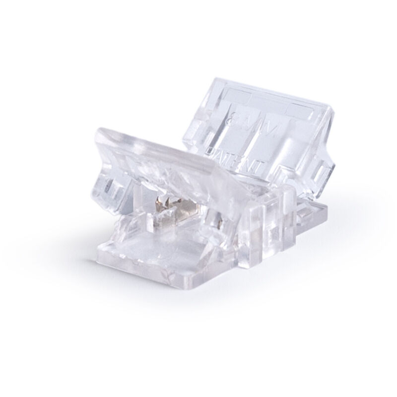 Connettore rapido Hippo per il collegamento di una striscia LED a un'altra. Adatto per strisce LED COB monocolore con PCB da 8 mm. Protezione IP20. Gamma di tensione 3-24V.