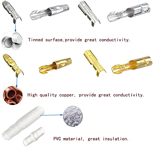 [Materiale Premium] I connettori terminali a proiettile sono realizzati in stagno placcato in ottone, che offre alta conduttività, antiossidazione, i manicotti isolanti sono realizzati in nylon, ritardante di fiamma isolato, sicuro e protetto.