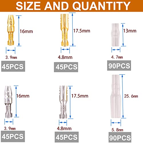 [Rimani organizzato] - Questi connettori per terminali a crimpare sono contenuti in una scatola di immagazzinaggio, facile da riporre e trasportare. È possibile ottenere terminali a proiettile in argento da 90 pezzi, terminali a proiettile in oro 90 pezzi, manicotti isolanti maschi da 90 pezzi, manicotti isolanti femminili da 100 pezzi.