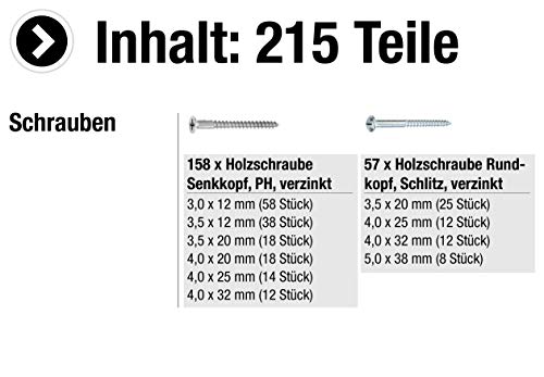 Contenuto della confezione: 158 viti per legno a testa svasata: 3,0 x 12 mm, 3,5 x 12 mm, 3,5 x 20 mm, 4,0 x 20 mm, 4,0 x 25 mm, 4,0 x 32 mm, 57 viti per legno a testa rotonda: 3,5 x 2 mm 0 mm. 4,0 x 25 mm, 4,0 x 32 mm, 5,0 x 38 mm
