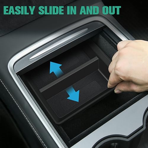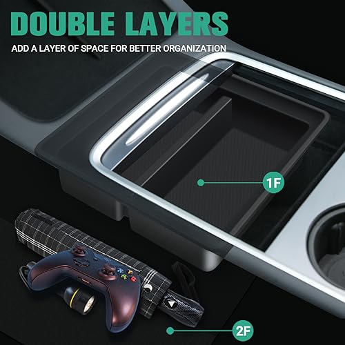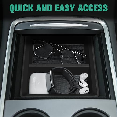 [Ottimizza Spazio di Archiviazione]: ZYB Center Console Organizer Tesla Model Y/Center Console Organizer Tesla Model 3 ti consente di riporre il tuo cellulare, patente di guida, carte bancarie, occhiali, denaro, chiavi, rossetto, ecc., consentendoti di utilizzarli meglio di spazio di stoccaggio e mantenerlo in posizione Non viene prodotto alcun rumore durante la guida.