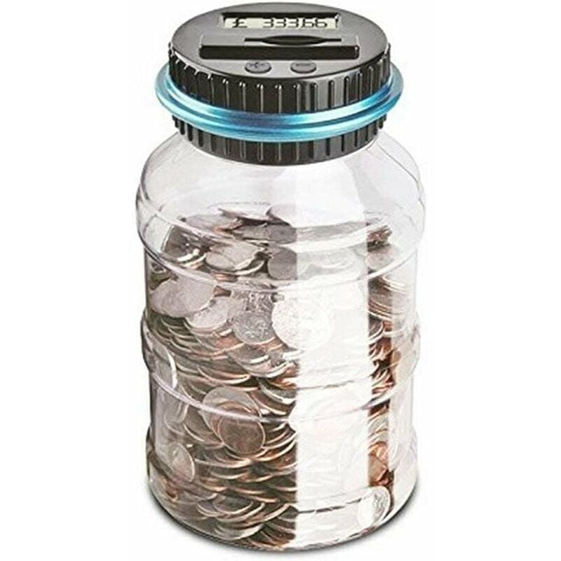 SALVA SOLDI DIGITALE: Un barattolo trasparente con uno schermo LCD sul coperchio. Conta le tue monete mentre scivolano nella fessura. Conta accuratamente i tuoi soldi e visualizza il totale per ogni deposito. Risparmio di denaro: il modo perfetto per conservare le tue monete inattive. GRANDE CAPACITÀ: ha una grande capacità fino a 1,8 litri e può contenere tra 800 e 1000 monete. Il design trasparente ti permetterà di vedere quanto spazio ti è rimasto. REGALO PERFETTO: il salvadanaio digitale è un regalo ideale per i tuoi figli, li aiuta a sviluppare una buona abitudine di risparmiare denaro. È anche un'ottima idea regalo per compleanni, Natale o qualsiasi altra occasione. QUALITÀ CERTIFICATA: Il denaro trasparente è realizzato in ABS e non è fragile come i barattoli di vetro. Accetta tutte le monete in sterline britanniche in circolazione. Richiede 2 batterie AAA (non incluse) DIMENSIONI DEL PRODOTTO: 20,2 x 11,5 cm circa.