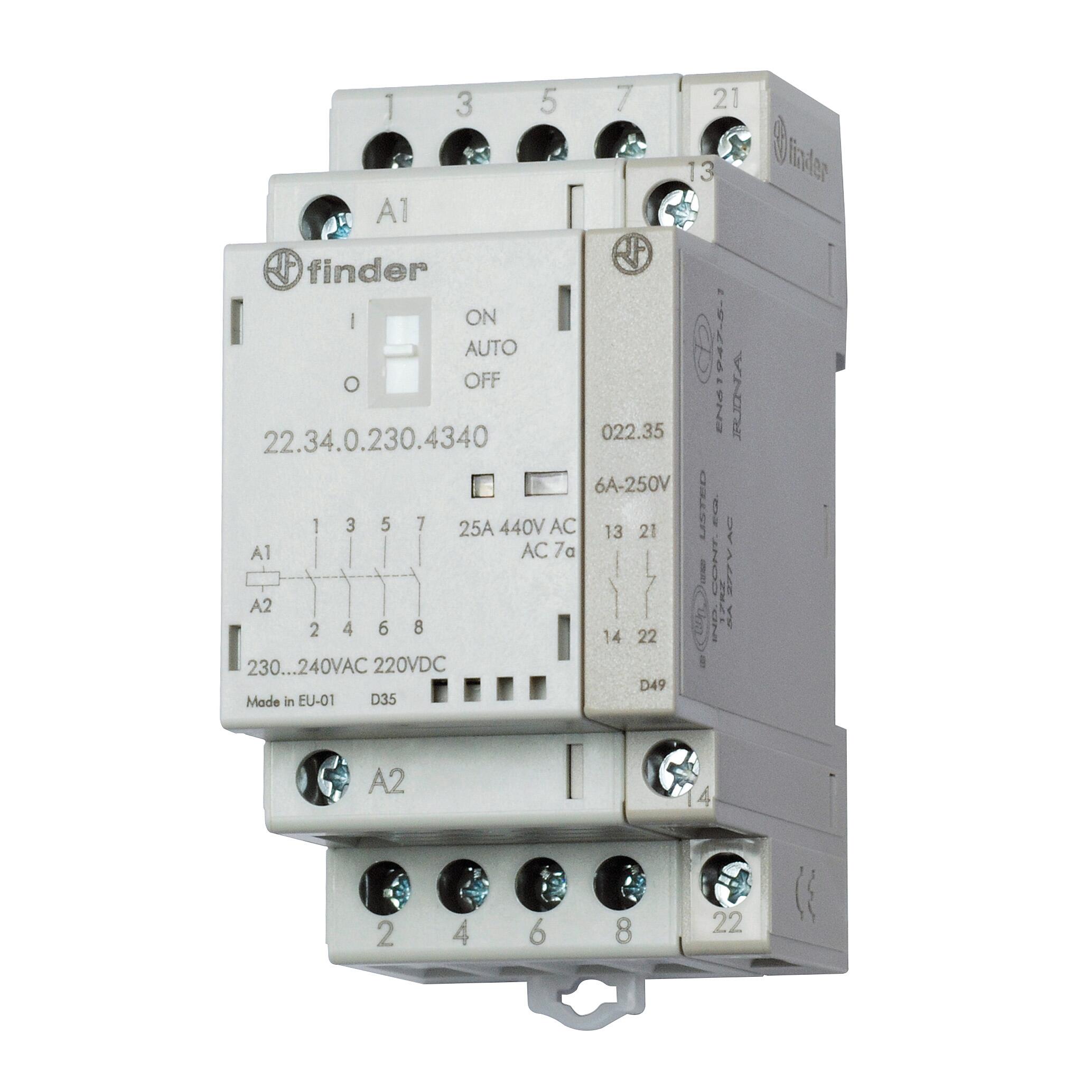 Selettore manuale + indicatore meccanico + LED, Standard, 24 V, Tutti i contatti NO, 4 contatti, 25 A, AgSnO2, AC (50/60Hz)/DC, Contattore modulare, 25 A. Ideale per comandare luci in uffici, bagni, aule, gestire l'illuminazione pubblica (strade e parcheggi) e abilitare l'energia nelle camere degli hotel