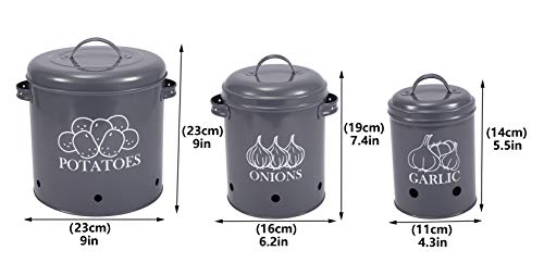 Set di tre barattoli - Set di 3 eleganti barattoli per conservare le patate, misura 23 cm x 23 cm, la scatola per cipolla misura 19 cm x 16 cm, la scatola per aglio misura 14 cm x 11 cm.