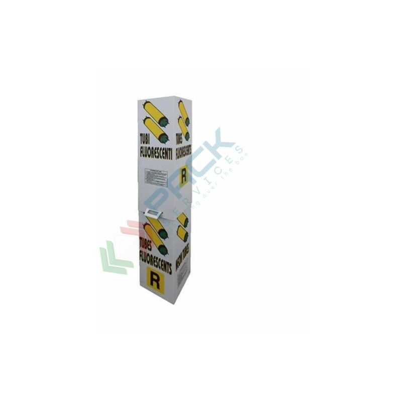 Cartone per la raccolta differenziata di tubi fluorescenti, Mis. 322 L x 300 P x 1500 H mm, capacità 30 neon. Contenitore per neon esausti di forma rettangolare verticale, con fondo piano, realizzato in cartone ondulato rinforzato. La parte inferiore è dedicata allo stoccaggio e contenimento del rifiuto, la parte superiore funge da coperchio con chiusura a scatto automontante, maniglie di presa ricavate dalle pareti esterne della parte inferiore su due lati opposti. All'interno del contenitore in cartone per neon esausti sono presenti 2 separatori interni ovvero una griglia forata di contenimento e sicurezza antirottura dei tubi fluorescenti esausti. Sulla superficie del contenitore è presente una stampa indicante la tipologia del contenuto ed istruzioni per il montaggio. Colore interno avana, esterno bianco con grafiche del rifiuto.